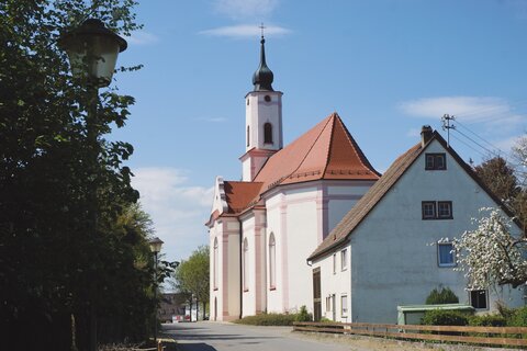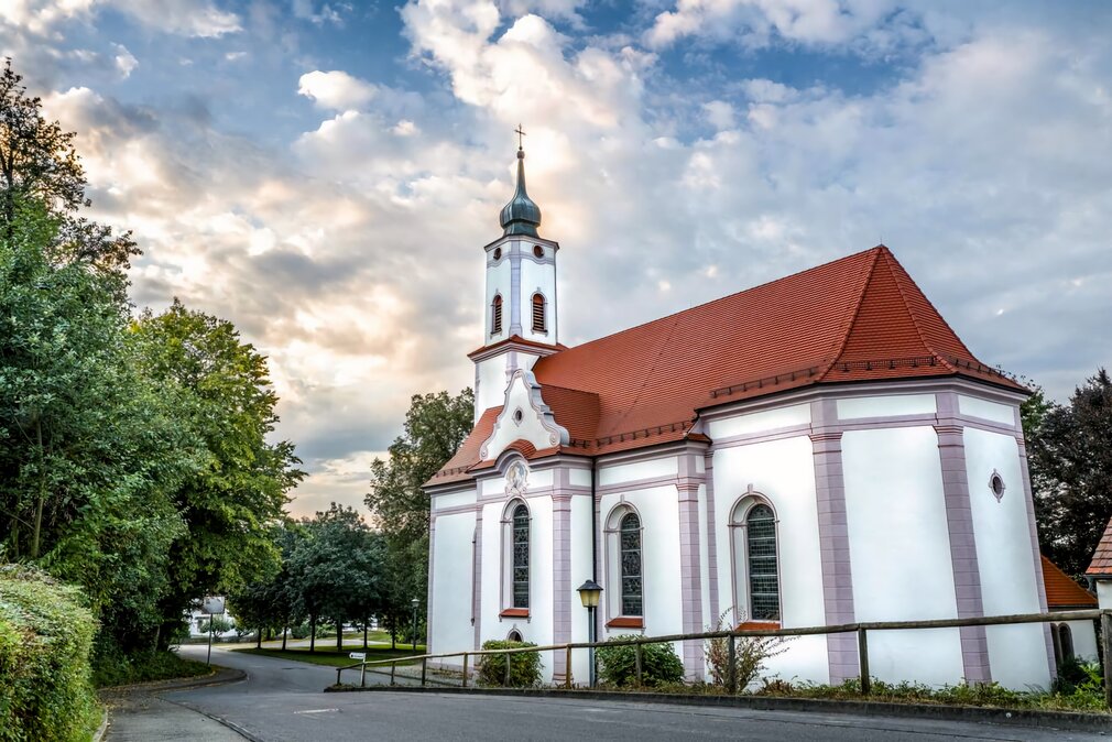 Hier fahren wir rechts → bis zur Marbacher Straße. In diese biegen wir links ← ein und radeln bis zur Herbertinger Straße. Diese befahren wir kurz und nach dem neuen Kreisverkehr biegen wir rechts → in die Kapellenstraße Richtung Marienkapelle (Schild) ein. Der kurze Anstieg führt uns direkt an der Marienkapelle vorbei.