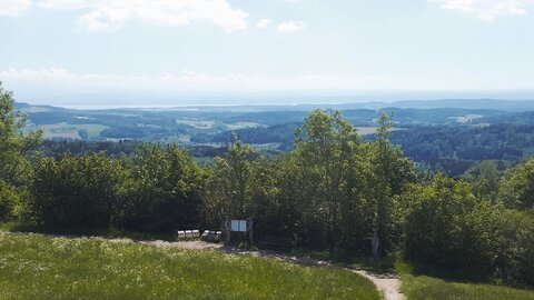 Hier genießen wir bei guter Wetterlage eine grandiose Sicht auf den Bodensee und die Alpen.