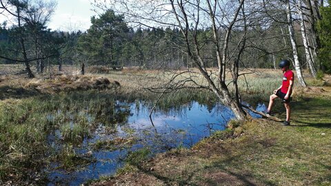 Wir lassen Kleintissen links ← liegen und fahren nach rechts → auf die Kreisstraße, der wir 1,3 km folgen. Dann radeln wir links ← in den Waldweg und folgen diesem, bis nach 2 km im Wald ein Abstecher an den nahegelegenen „Blinder See“ möglich ist.