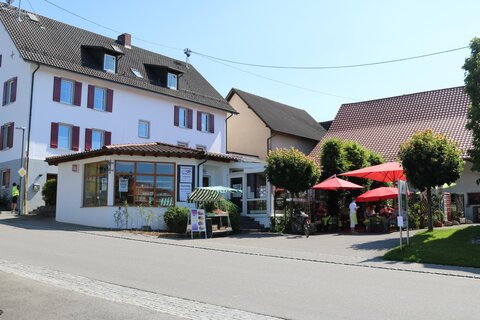 Wir biegen links ← ab und fahren nach 200 m leicht rechts → auf den Radweg nach Dürnau. Hier halten wir uns links ←, biegen in die Hauptstraße ein und sehen rechts das Cafe Gugelhupf.