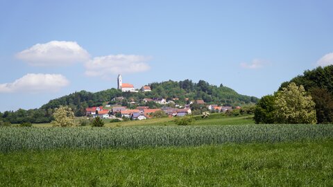 Danach geht es nach einem letzten Blick zurück zum Bussen über Felder in den Wald, den wir bis zur Straße durchfahren. Dieser folgen wir nach rechts → am Seelenhof vorbei bis nach Kanzach.