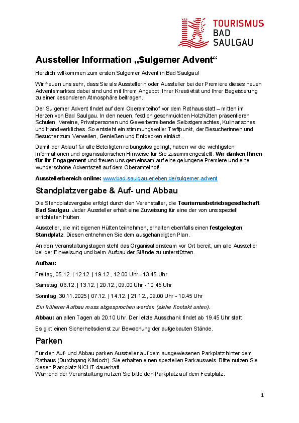 Damit der Ablauf für alle Beteiligten reibungslos gelingt, haben wir die wichtigsten Informationen und organisatorischen Hinweise für Sie zusammengestellt. Wir danken Ihnen für Ihr Engagement und freuen uns gemeinsam auf eine gelungene Premiere und eine wunderschöne Adventszeit auf dem Oberamteihof!