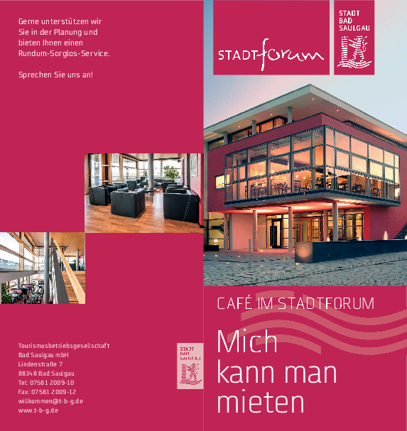 Ausreichend Parkraum steht im angeschlossenen Parkhaus zur Verfügung, mit Zugang trockenen Fußes zu den Räumlichkeiten. Zudem bietet Bad Saulgau drei Parkhäuser und fünf öffentliche Stellflächen mit insgesamt rund 625 Parkplätzen.